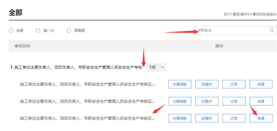 4.进入部门后,在搜索框输入“专职安全”点击“施工单位主要负责人、项目负责人、专职安全生产管理人员安全生产考核”下拉框,点击“证书延续业务申请”并按照图示流程操作。