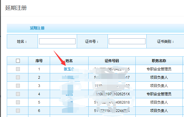 4.进入部门后,在搜索框输入“专职安全”点击“施工单位主要负责人、项目负责人、专职安全生产管理人员安全生产考核”下拉框,点击“证书延续业务申请”并按照图示流程操作;在列表中选择需要延期的证书,按系统提示申请业务并提交申请至企业版(需要输入手机验证码才能最终提交),联系所在企业在企业版内完成延期发证工作(延期证书由企业在系统内发证)。企业版完成发证业务后,查看证书有效期是否更新。
