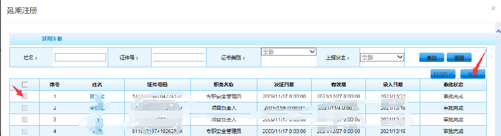 5.点击需要延期的申报人员姓名,进入个人详情,勾选个人承诺、企业承诺并点击“保存”,退出返回列表,勾选需要发证的人员,点击“发证”,输入手机验证码后确认发证。完成后查看证书有效期是否更新。
