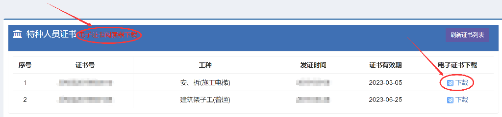 2.打印或查看特种作业证书电子版需先下载电子证书,再下载电子签章证书阅读器。下载电子签章证书阅读器,可在本页末下载附件。