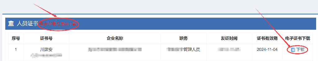 2.打印或查看安全能力考核证书电子版需先下载电子证书,再下载电子签章证书阅读器。下载电子签章证书阅读器,可在本页末下载附件。